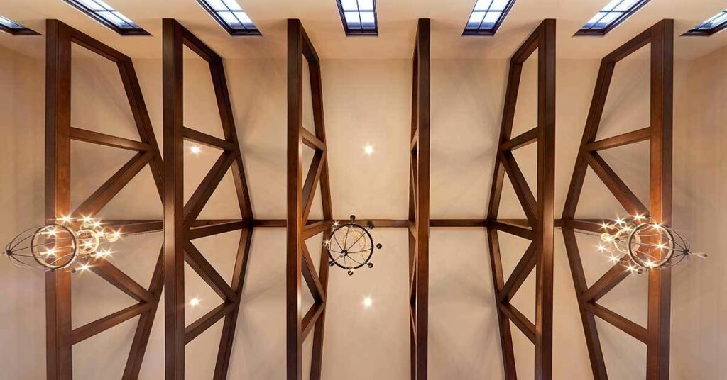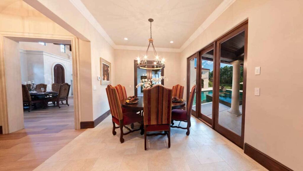 Let’s dive right into the marvel of this Tuscan abode, beginning with its awe-inspiring two-story ceilings adorned with rustic beams.
